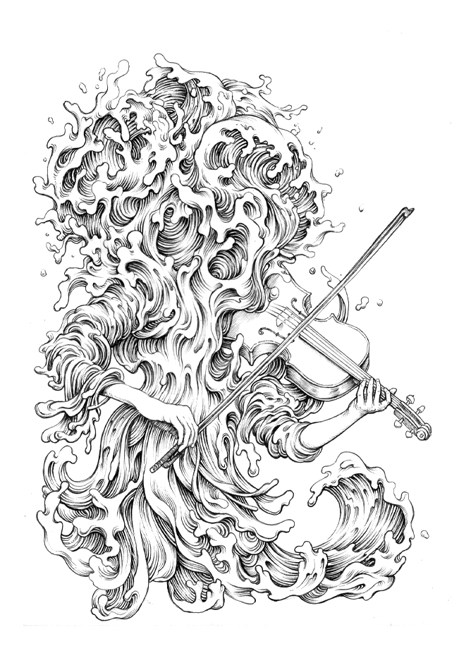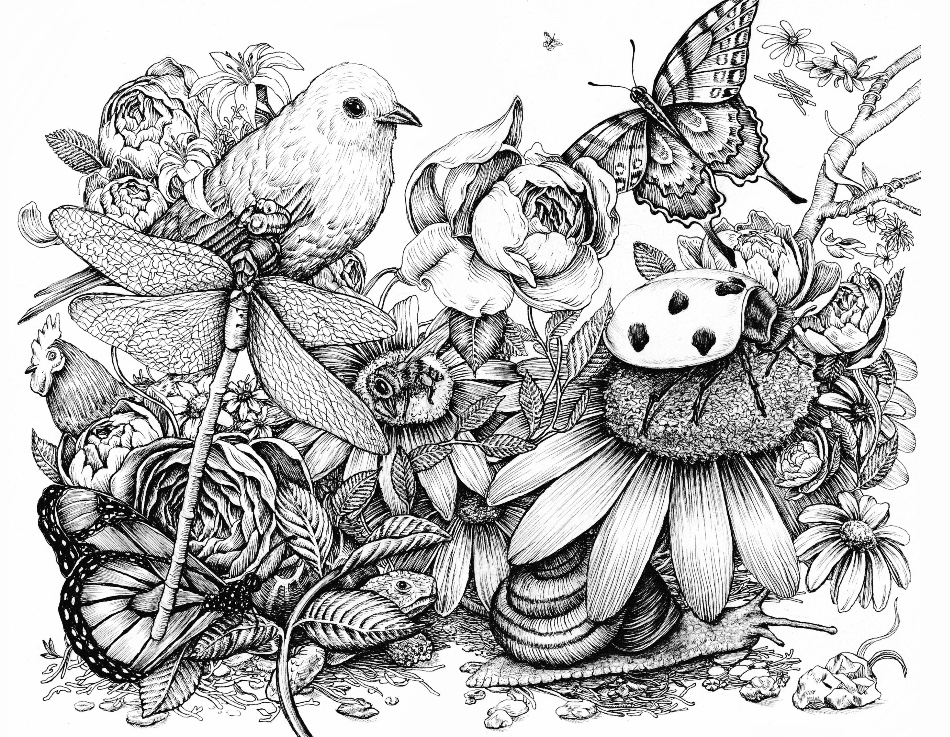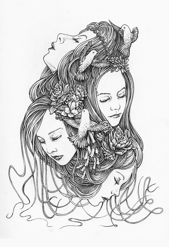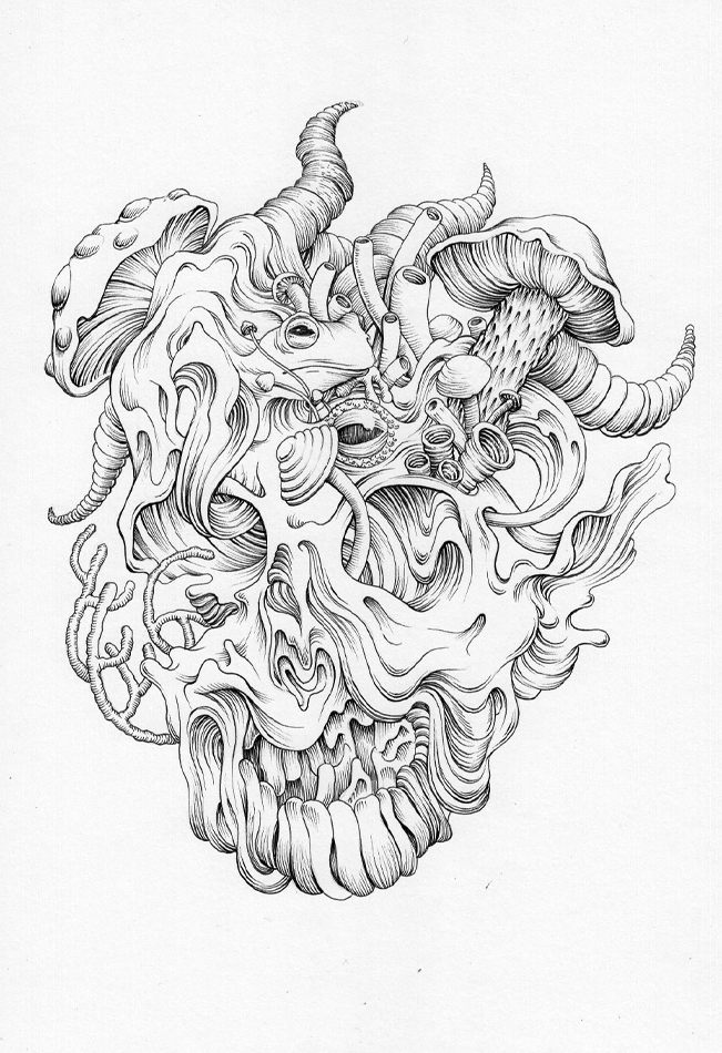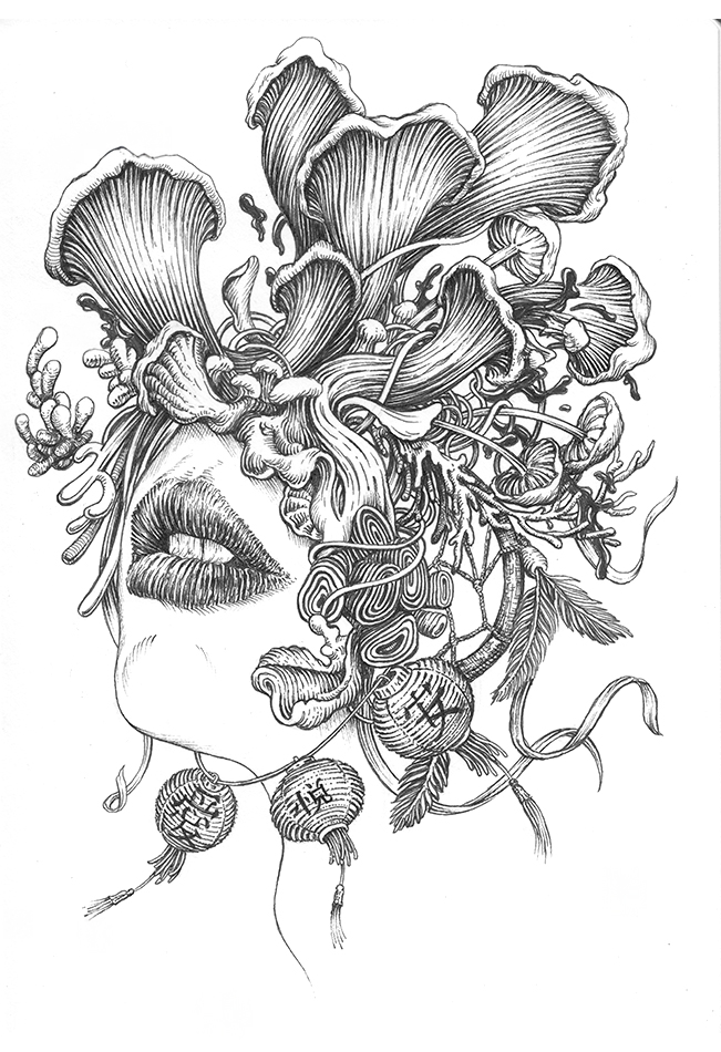 Tim draws inspiration from both natural and surrealist influences to produce highly detailed ink drawings on paper. His drawings often depict themes of growth, personal transformation and the transitory.