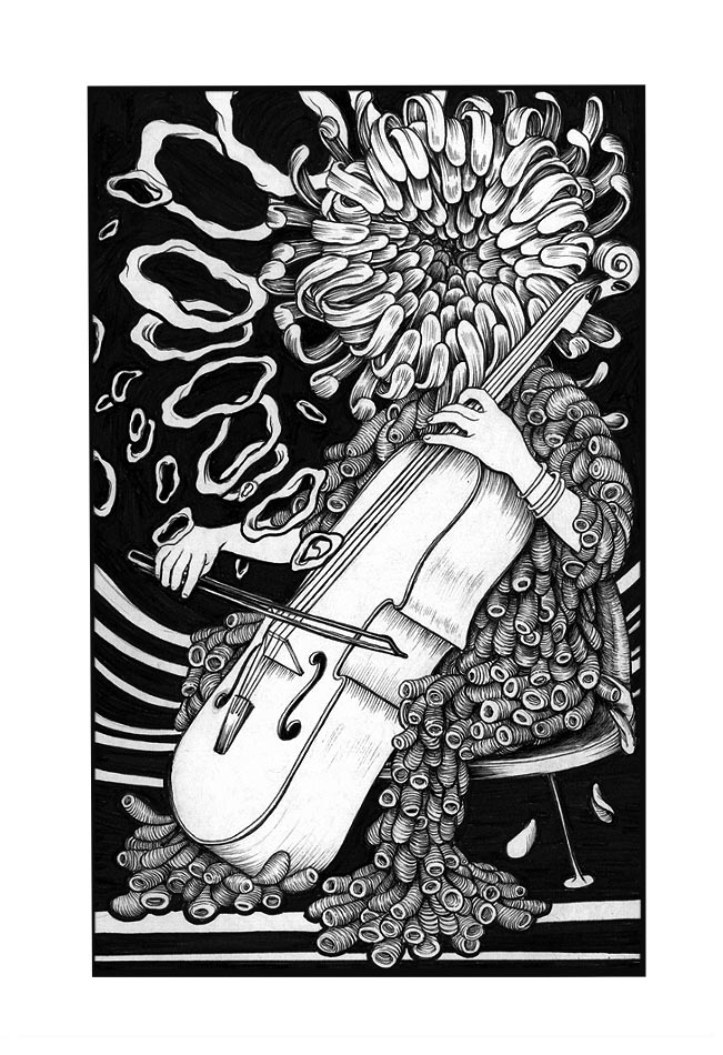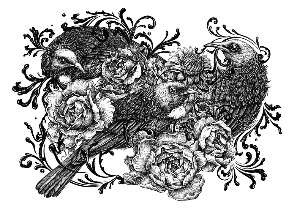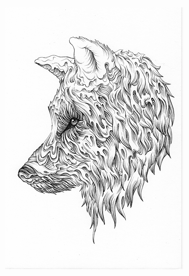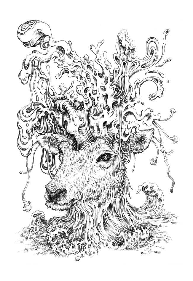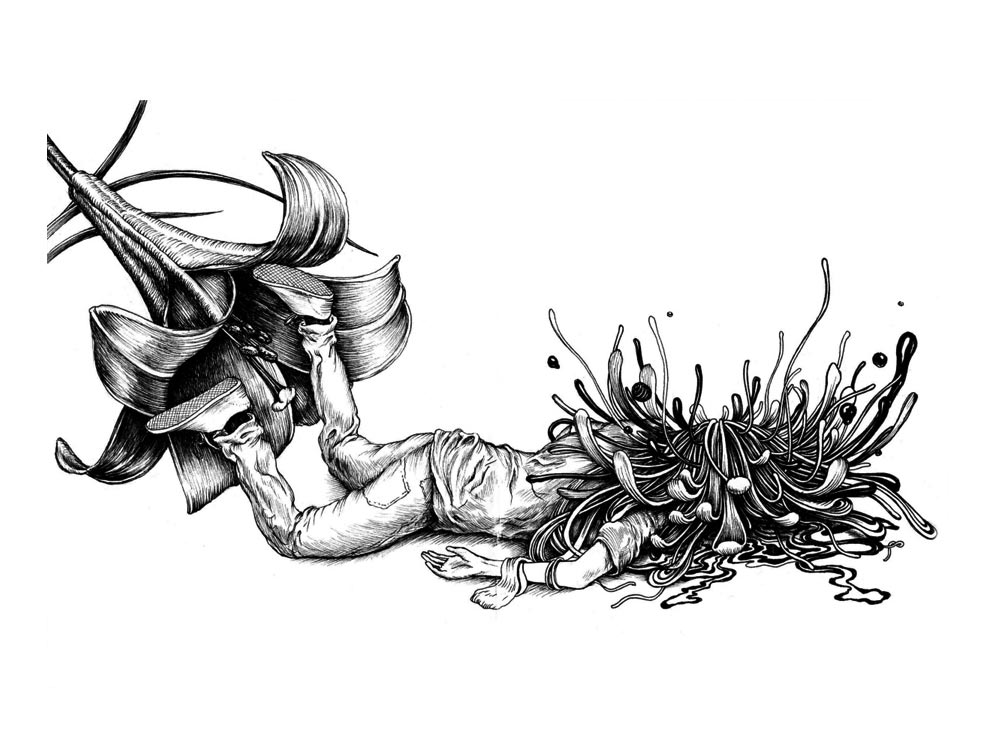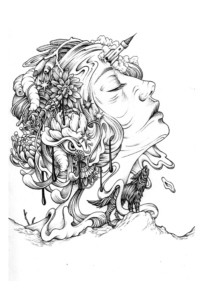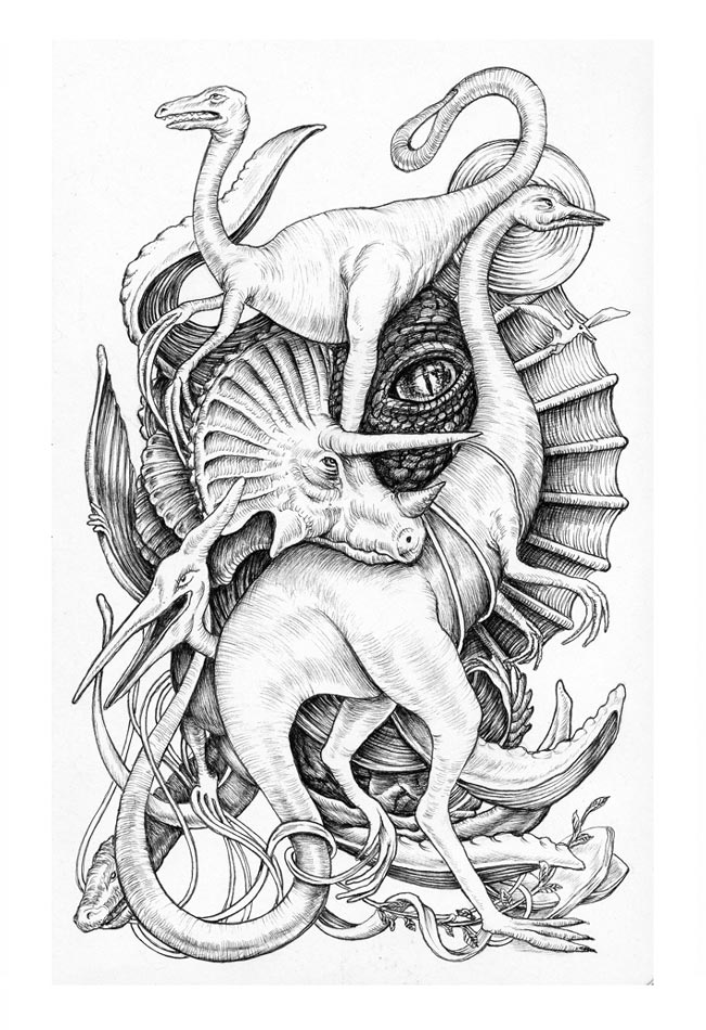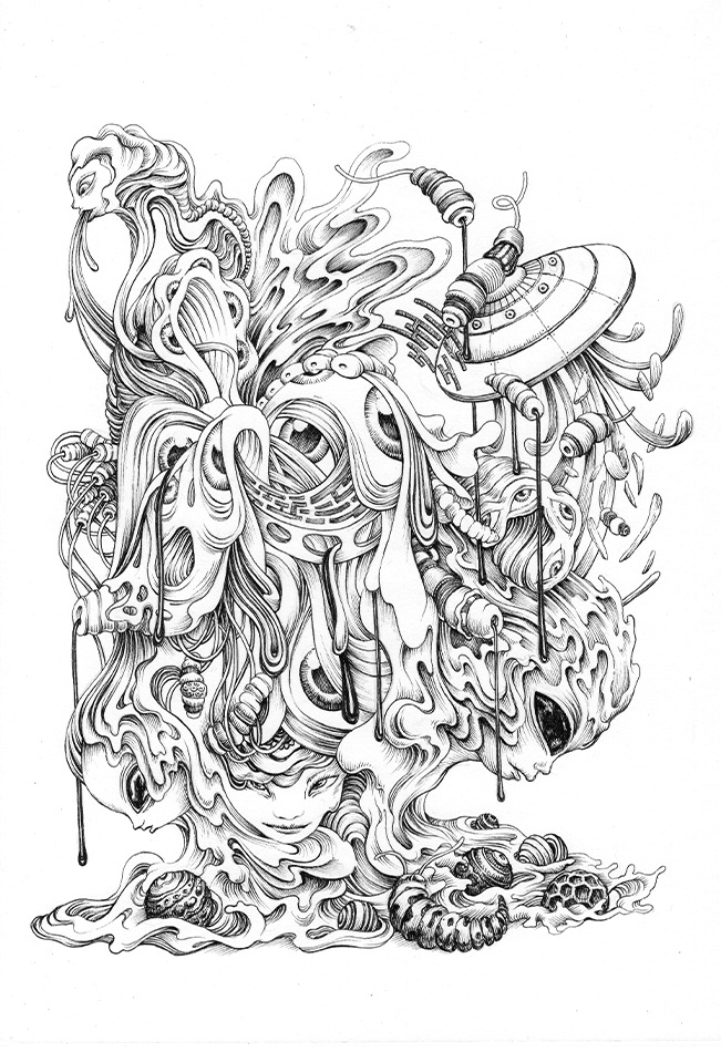 Tim draws inspiration from both natural and surrealist influences to produce highly detailed ink drawings on paper. His drawings often depict themes of growth, personal transformation and the transitory.