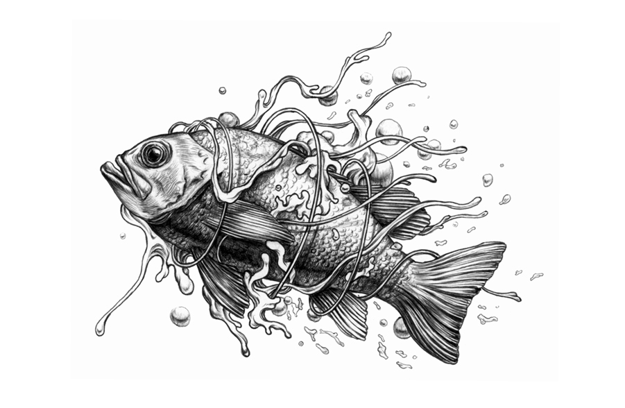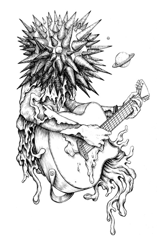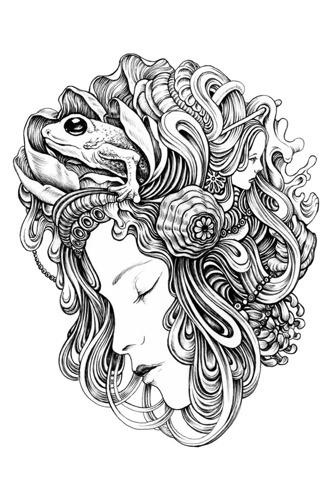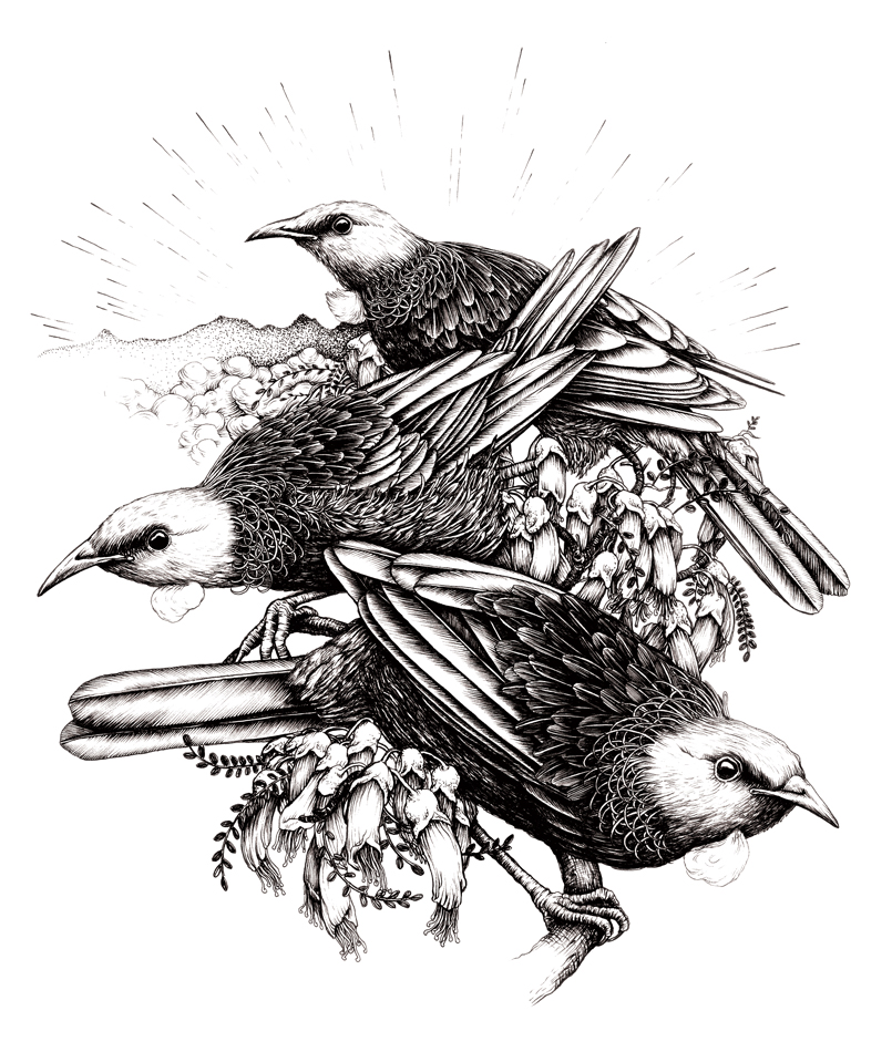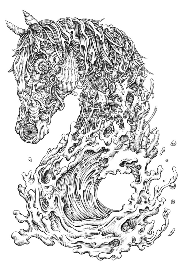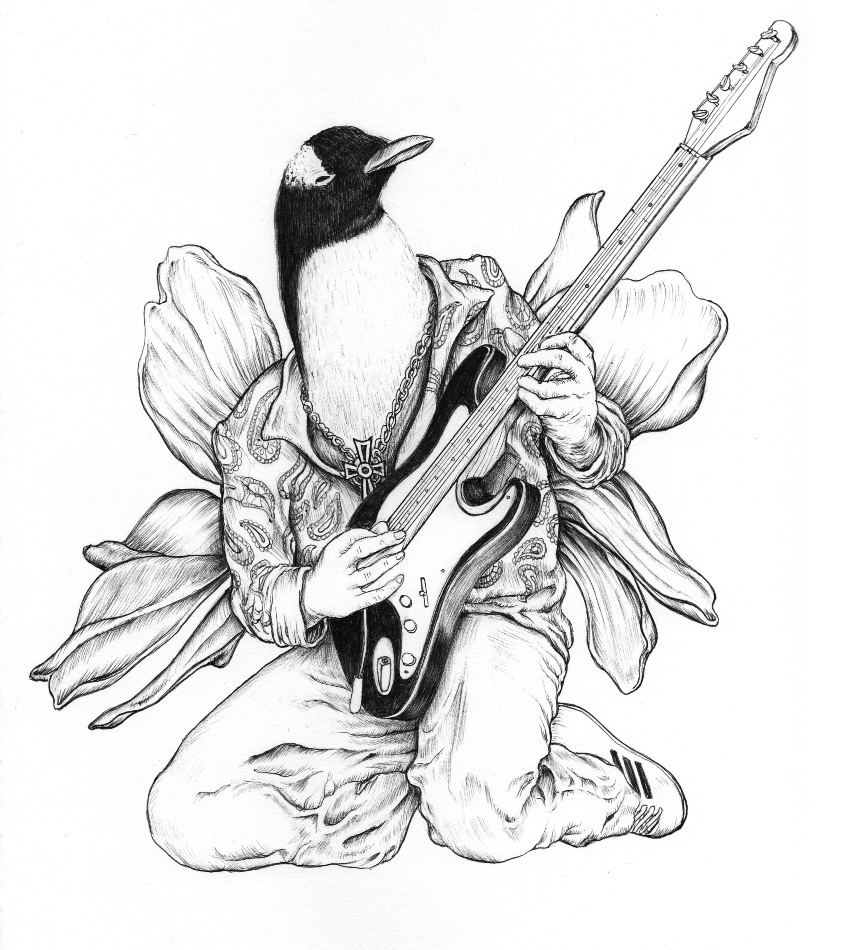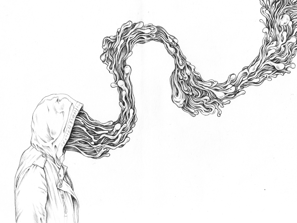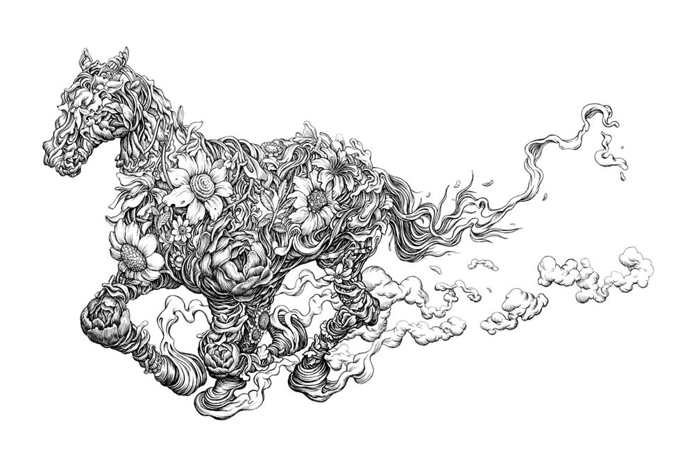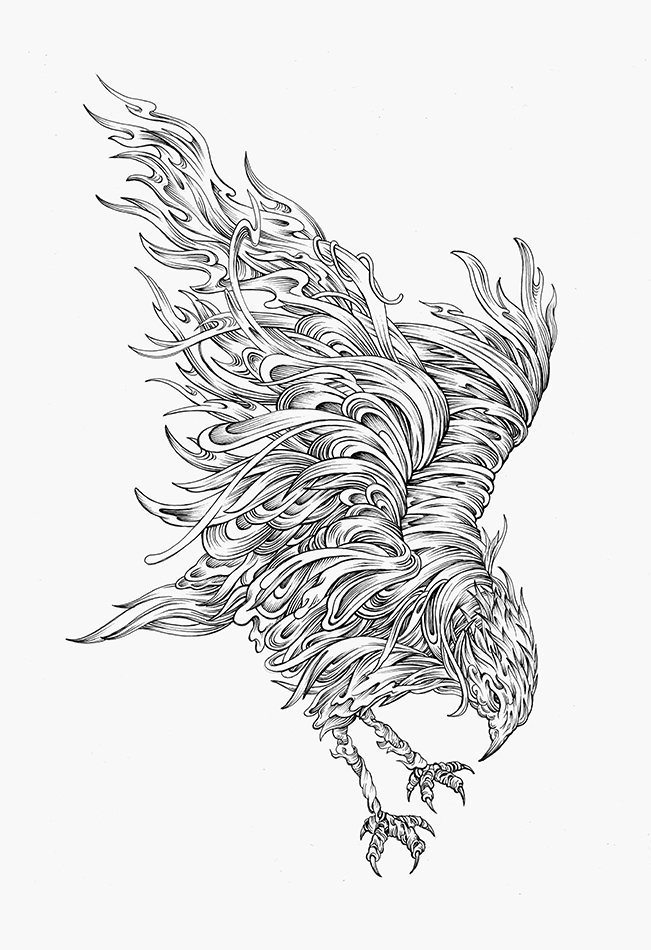 Tim draws inspiration from both natural and surrealist influences to produce highly detailed ink drawings on paper. His drawings often depict themes of growth, personal transformation and the transitory.